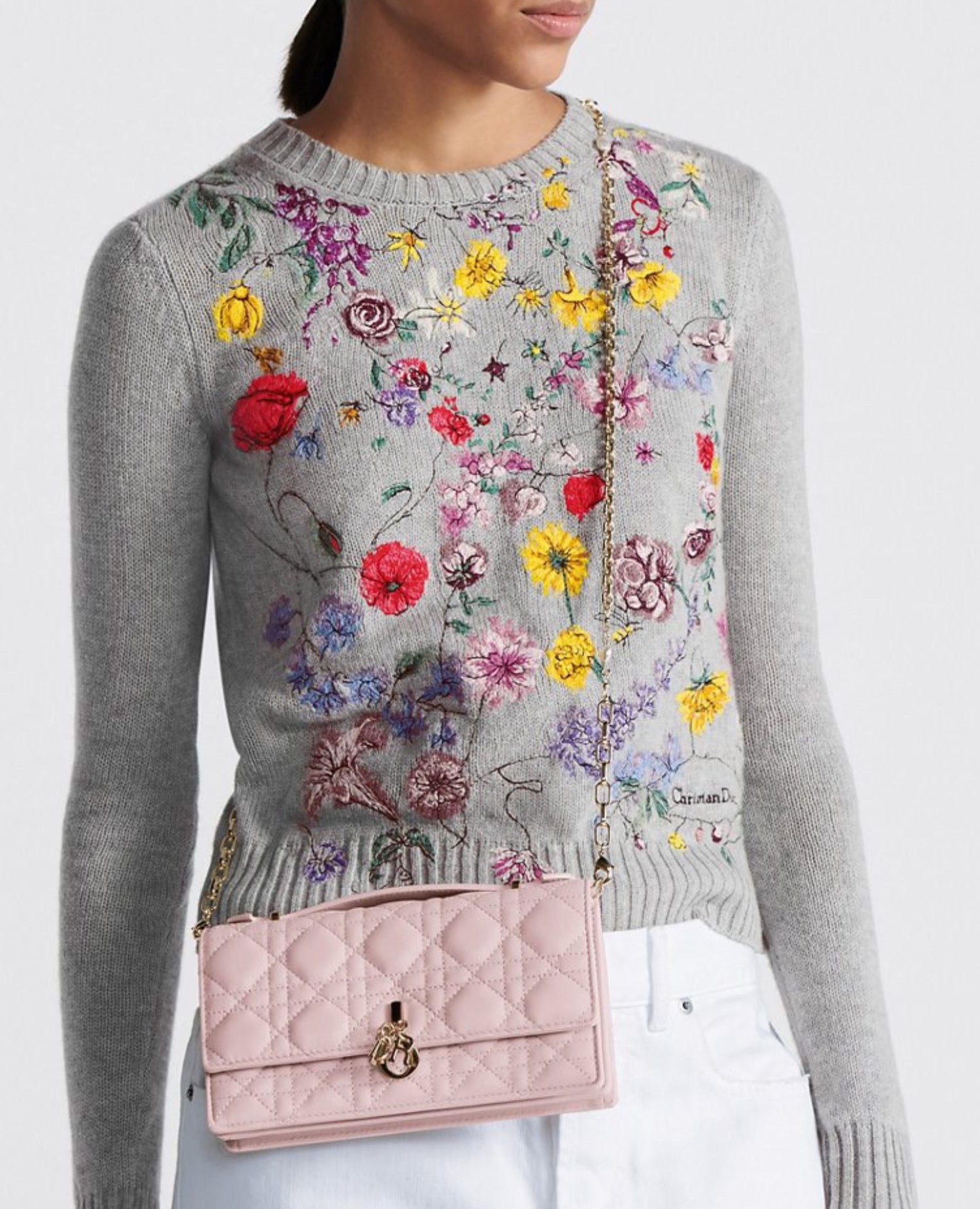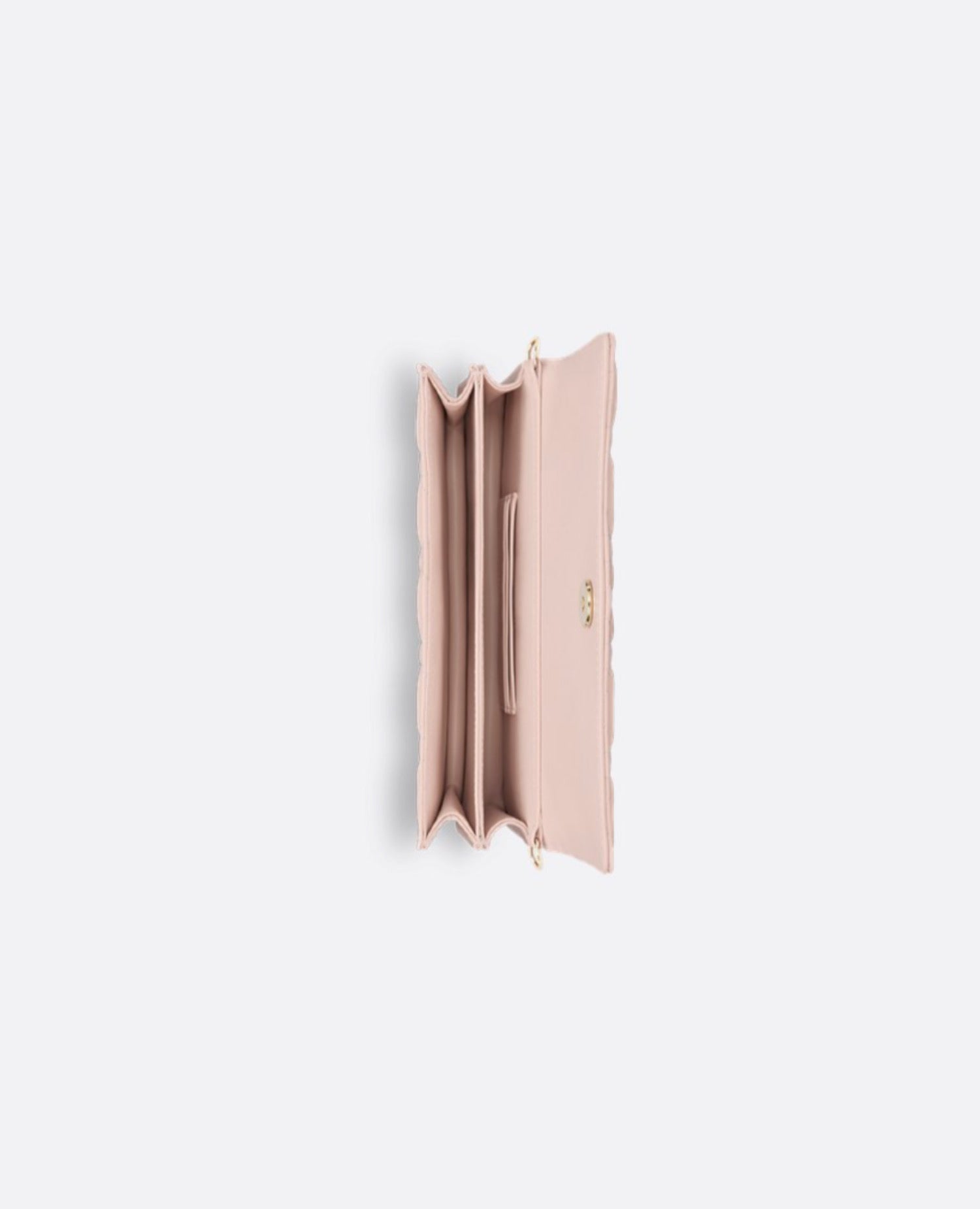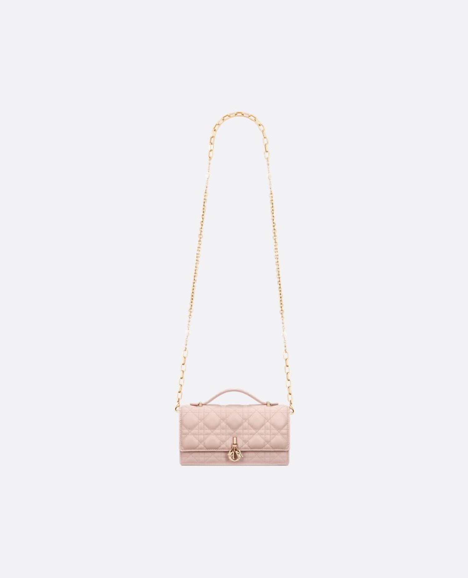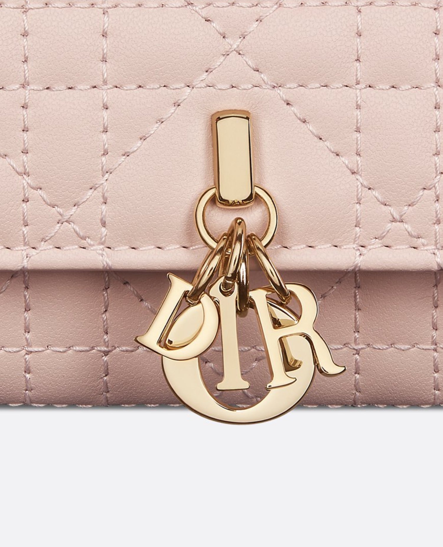 The My Dior mini bag expands the line with an elegant and functional design. Crafted in powder pink Cannage lambskin, it features a flap enhanced by D.I.O.R. charms on the front. Equipped with compartments and card slots, the functional accessory will hold any essentials and is the ideal day and evening companion. A top handle completed by a removable chain punctuated with resin pearls allows the bag to be carried by hand or worn crossbody.