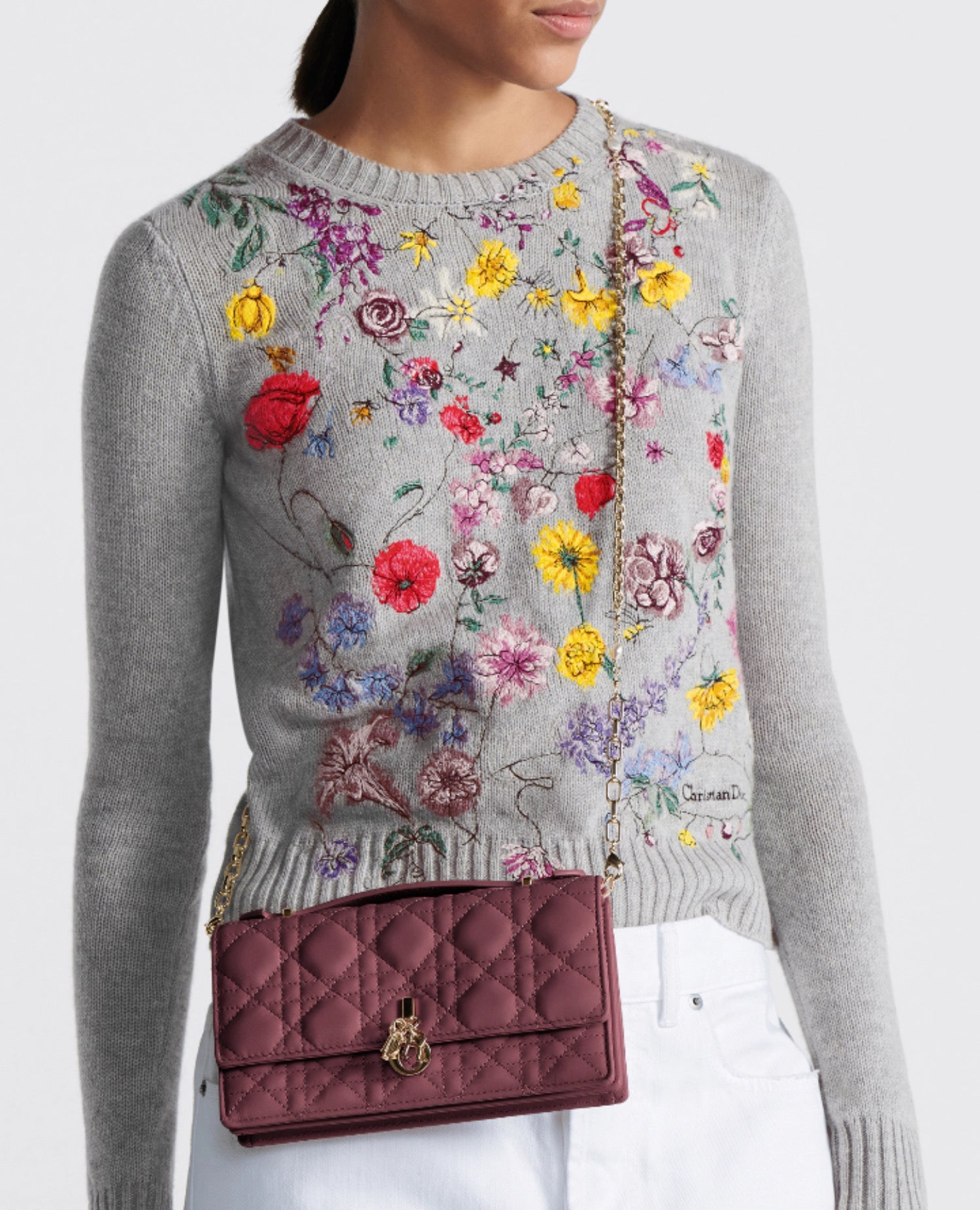 The Miss Dior mini bag expands the line with an elegant and functional design. Crafted in burgundy Cannage lambskin, it features a flap enhanced by D.I.O.R. charms on the front. Equipped with compartments and card slots, the functional accessory will hold any essentials and is the ideal day and evening companion. A top handle completed by a removable chain punctuated with resin pearls allows the bag to be carried by hand or worn crossbody.