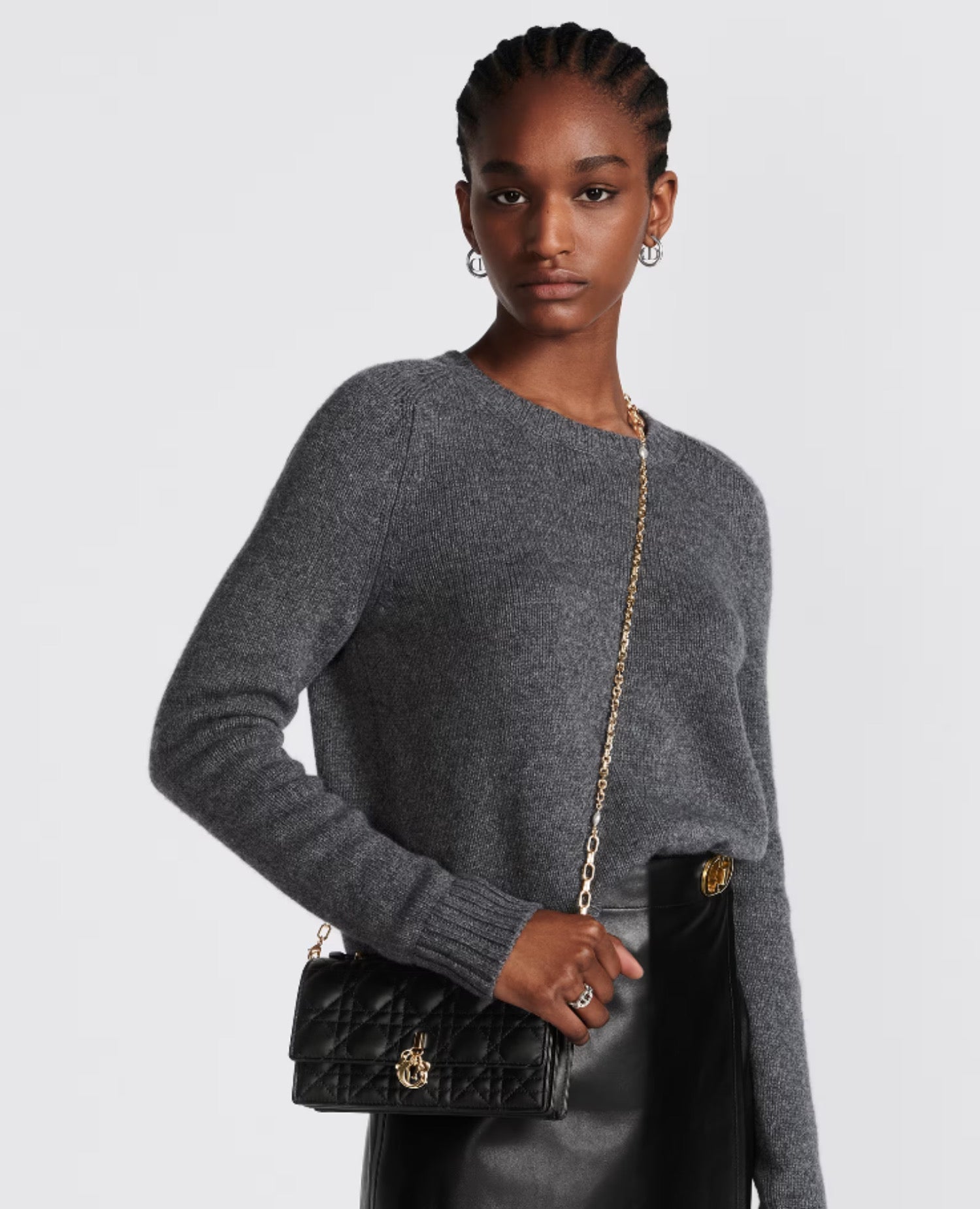 The Miss Dior mini bag expands the line with an elegant and functional design. Crafted in black Cannage lambskin, it features a flap enhanced by a D.I.O.R. charm on the front. Equipped with compartments and card slots, the functional accessory holds all the essentials and is the ideal day and evening companion. A top handle completed by a removable chain punctuated with resin pearls allows the bag to be carried by hand or worn crossbody.