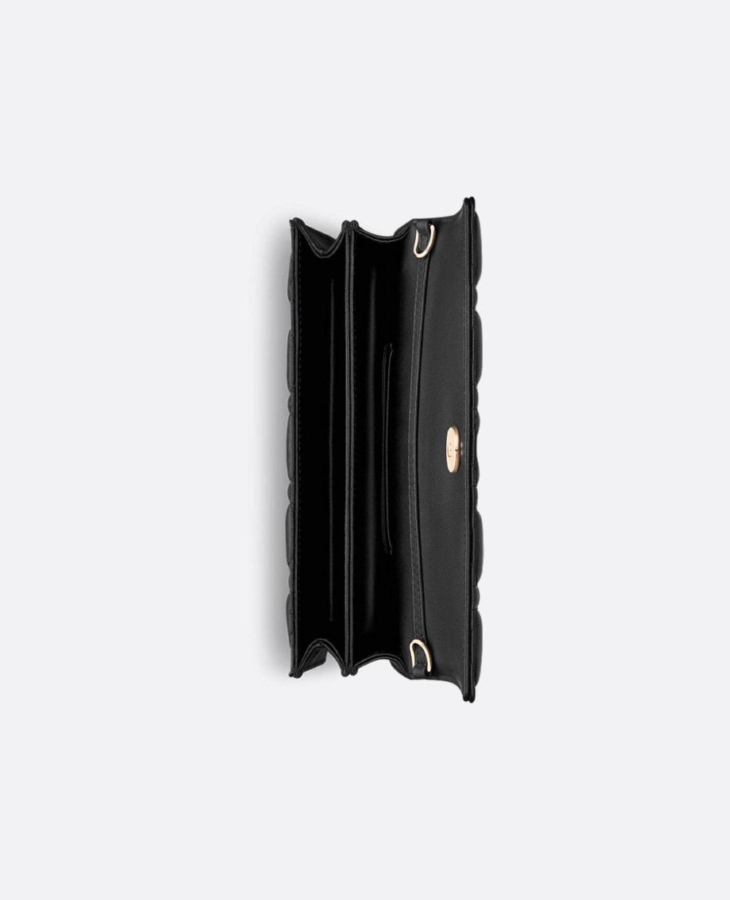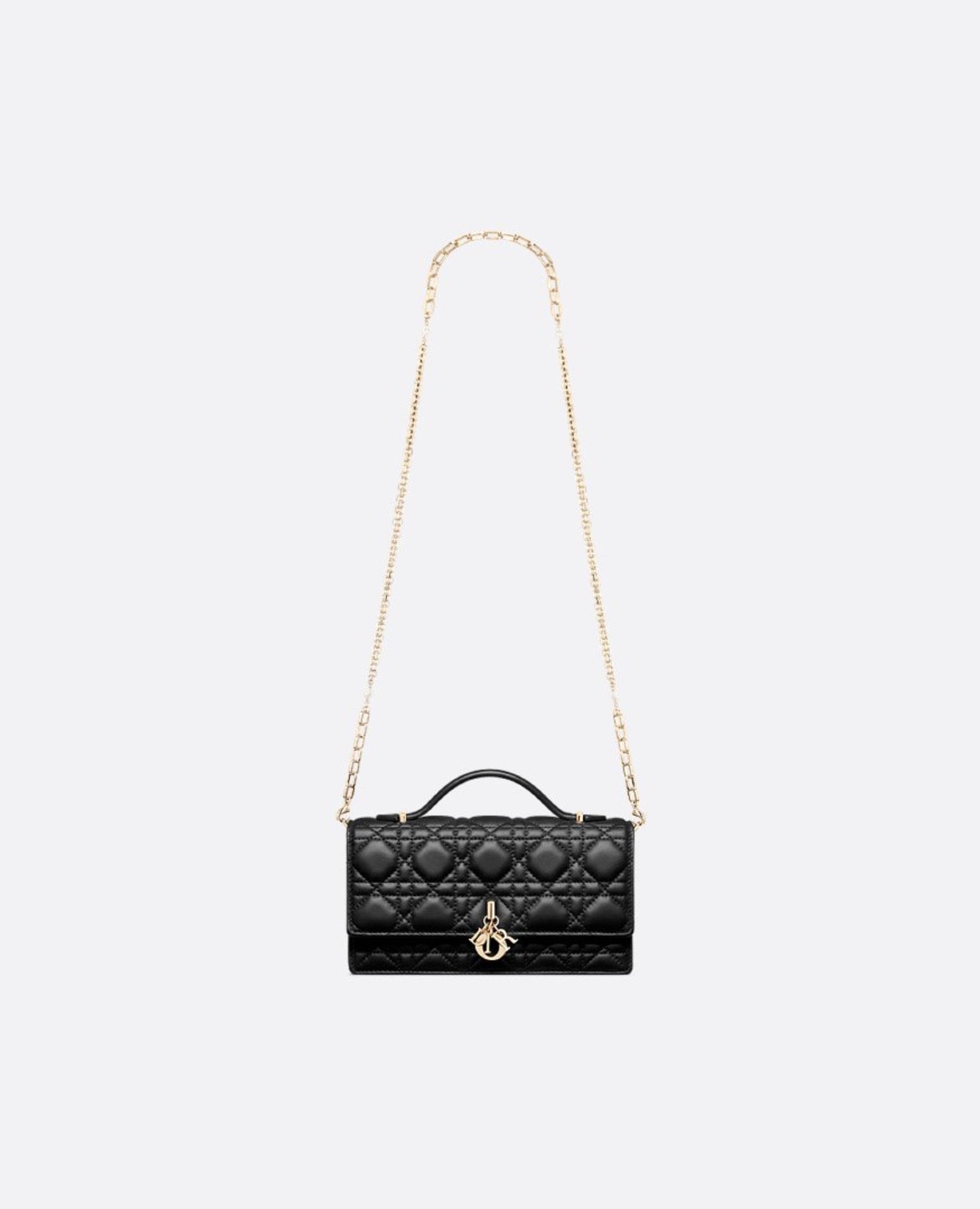 The Miss Dior mini bag expands the line with an elegant and functional design. Crafted in black Cannage lambskin, it features a flap enhanced by a D.I.O.R. charm on the front. Equipped with compartments and card slots, the functional accessory holds all the essentials and is the ideal day and evening companion. A top handle completed by a removable chain punctuated with resin pearls allows the bag to be carried by hand or worn crossbody.