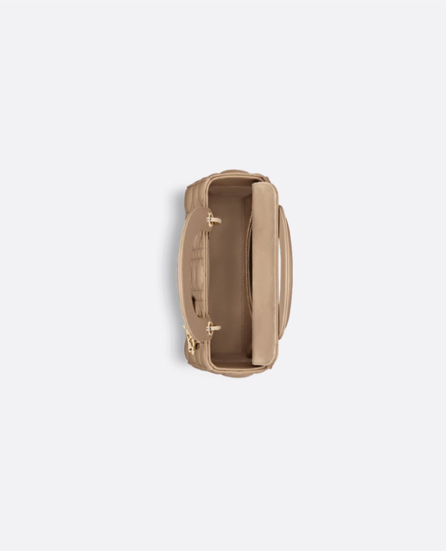 The Lady Dior My ABCDior bag epitomizes Dior's vision of elegance and beauty. Sleek and refined, the timeless style is crafted in biscuit lambskin with Cannage stitching, creating the unmistakable quilted texture. Pale gold-finish metal D.I.O.R. charms offer elegant appeal. Featuring a strap that can be personalized with symbolic badges, the small, unique design may be carried by hand or worn crossbody.