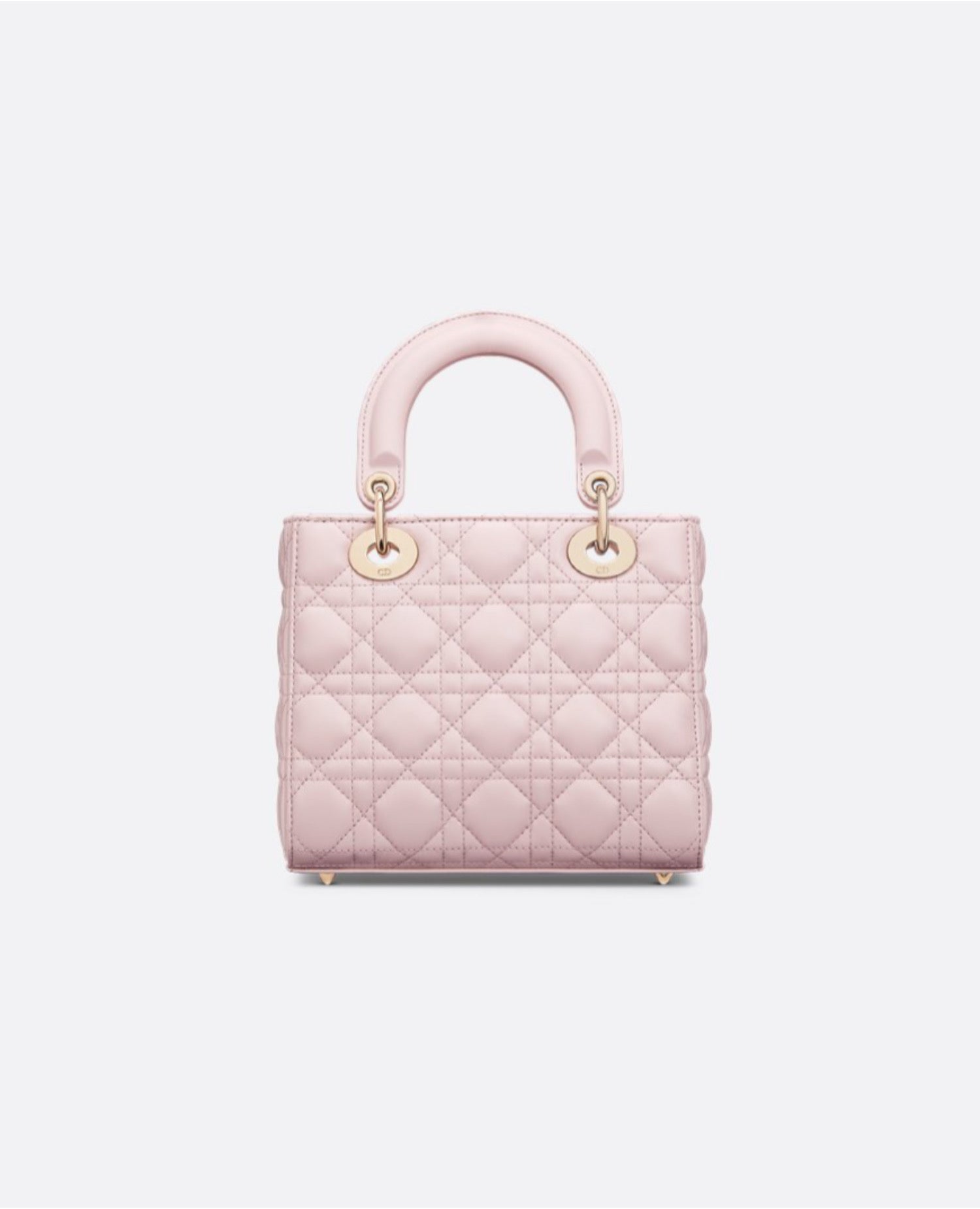 The Lady Dior My ABCDior bag epitomizes Dior's vision of elegance and beauty. Sleek and refined, the timeless style is crafted in pale pink lambskin with Cannage stitching, creating the unmistakable quilted texture. Pale gold-finish metal D.I.O.R. charms offer elegant appeal. Featuring a strap that can be personalized with symbolic badges, the small, unique design may be carried by hand or worn crossbody.