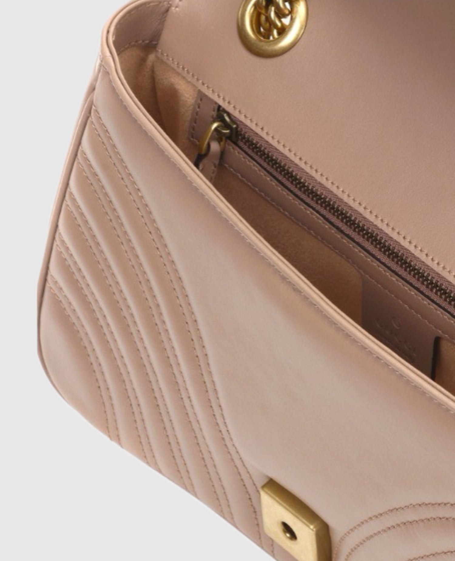 Embellished with the archival Double G logo, first introduced in the 1970s, the GG Marmont bag has established itself as a signature style of the House. The two capital letters of the style’s name refer to this emblem, recognizable by the partially overlapping hardware on the handbag’s front. Crafted from soft matelassé leather, the elegant handbag is evocative of Florentine craftsmanship.