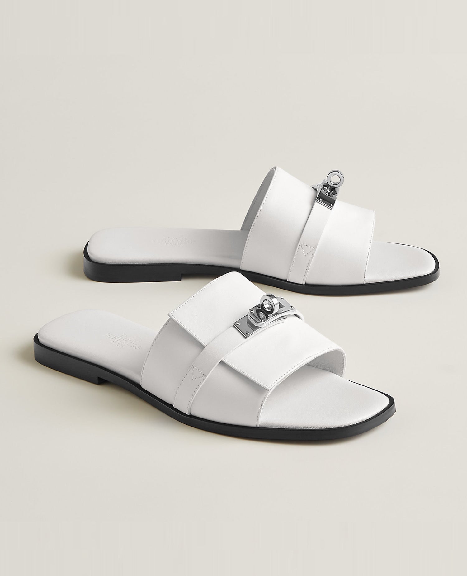 Sandal in calfskin with iconic palladium-plated Kelly buckle.