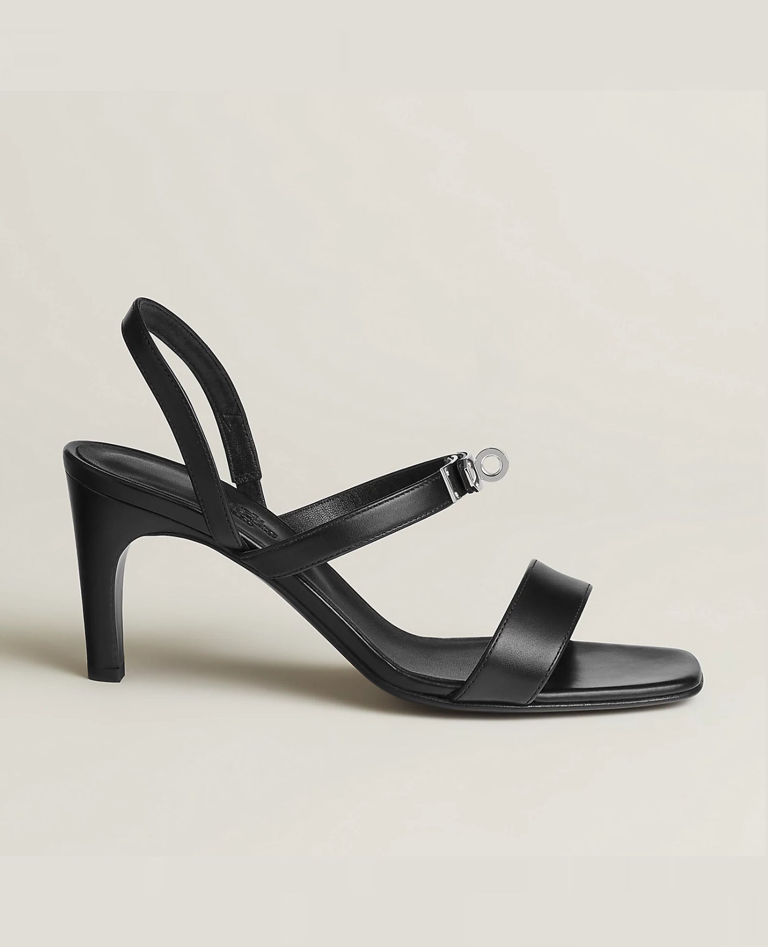 High heel sandal in calfskin with iconic palladium-plated Kelly buckle.