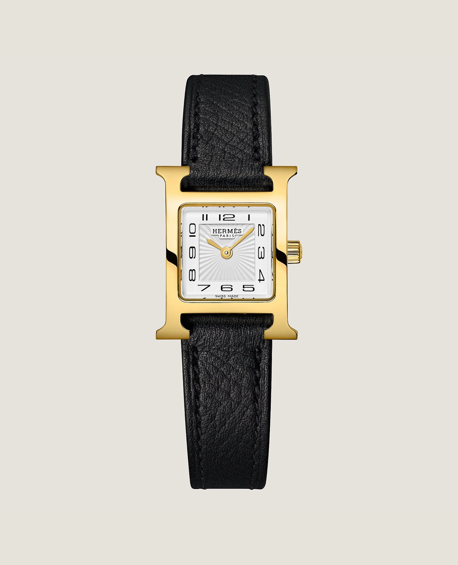 Yellow gold-plated steel watch, quartz movement, white dial, long interchangeable strap in black Epsom calfskin