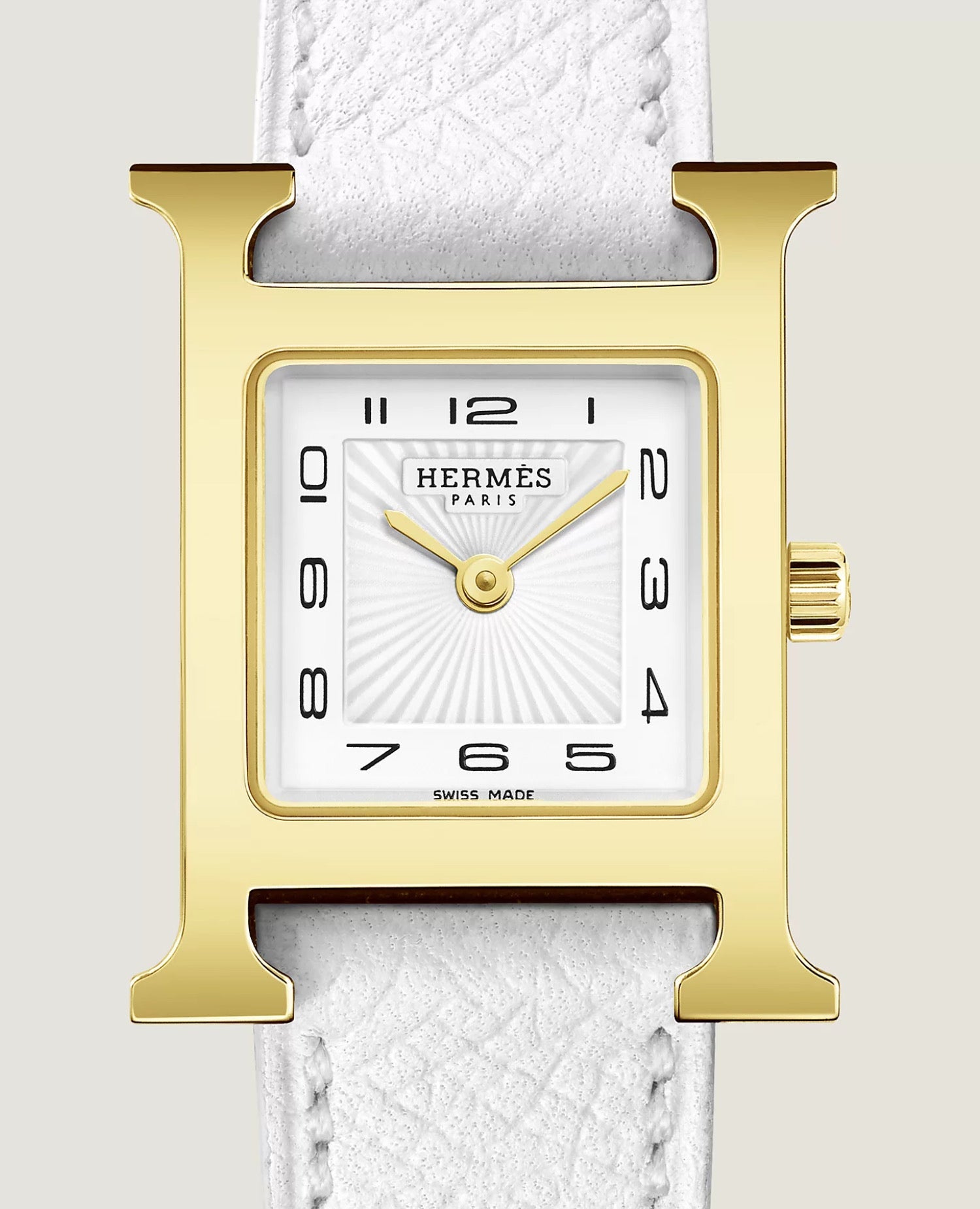 Yellow gold-plated steel watch, quartz movement, white dial, long interchangeable strap in white Epsom calfskin