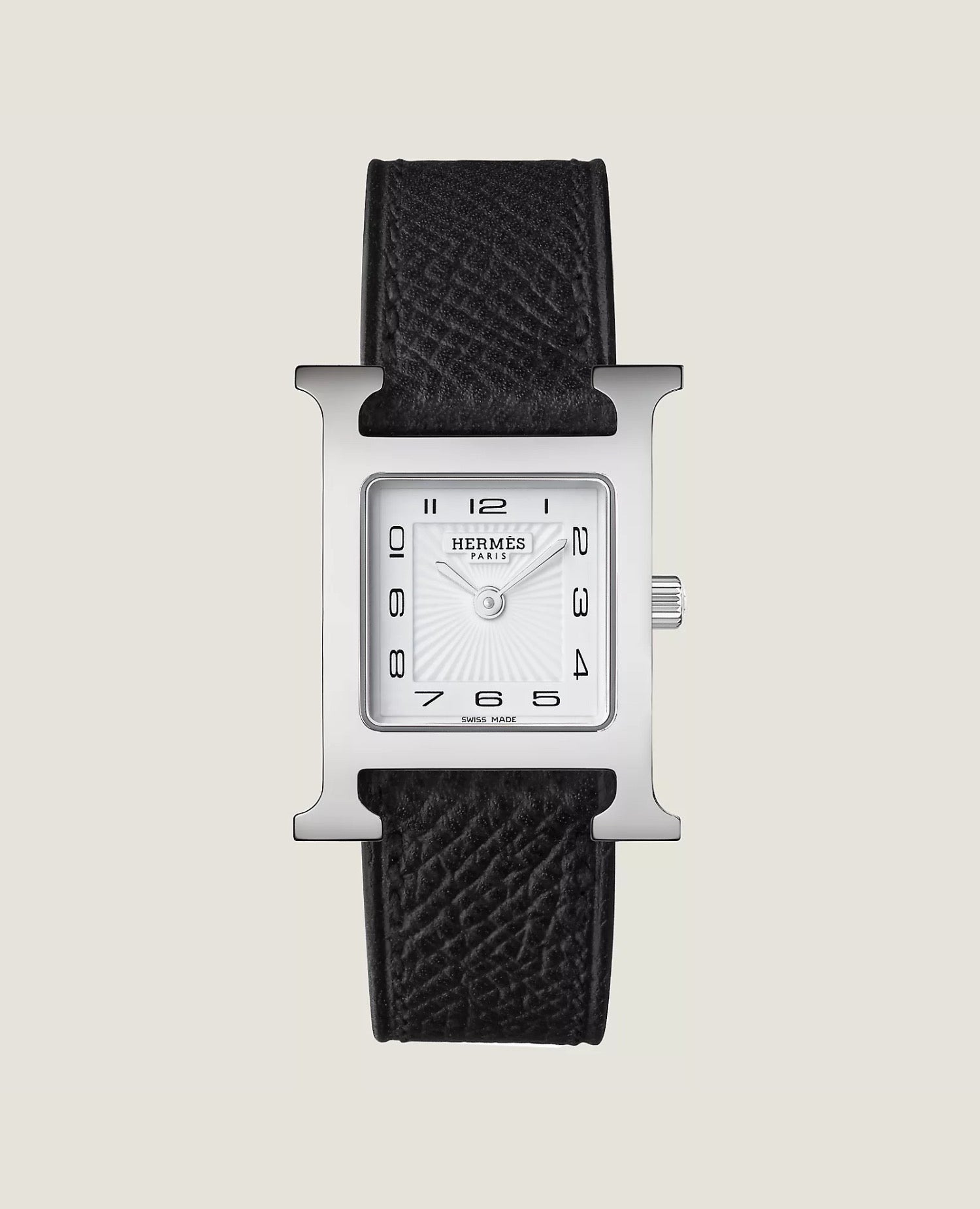 Steel watch, quartz movement, white dial, long interchangeable strap in black Epsom calfskin