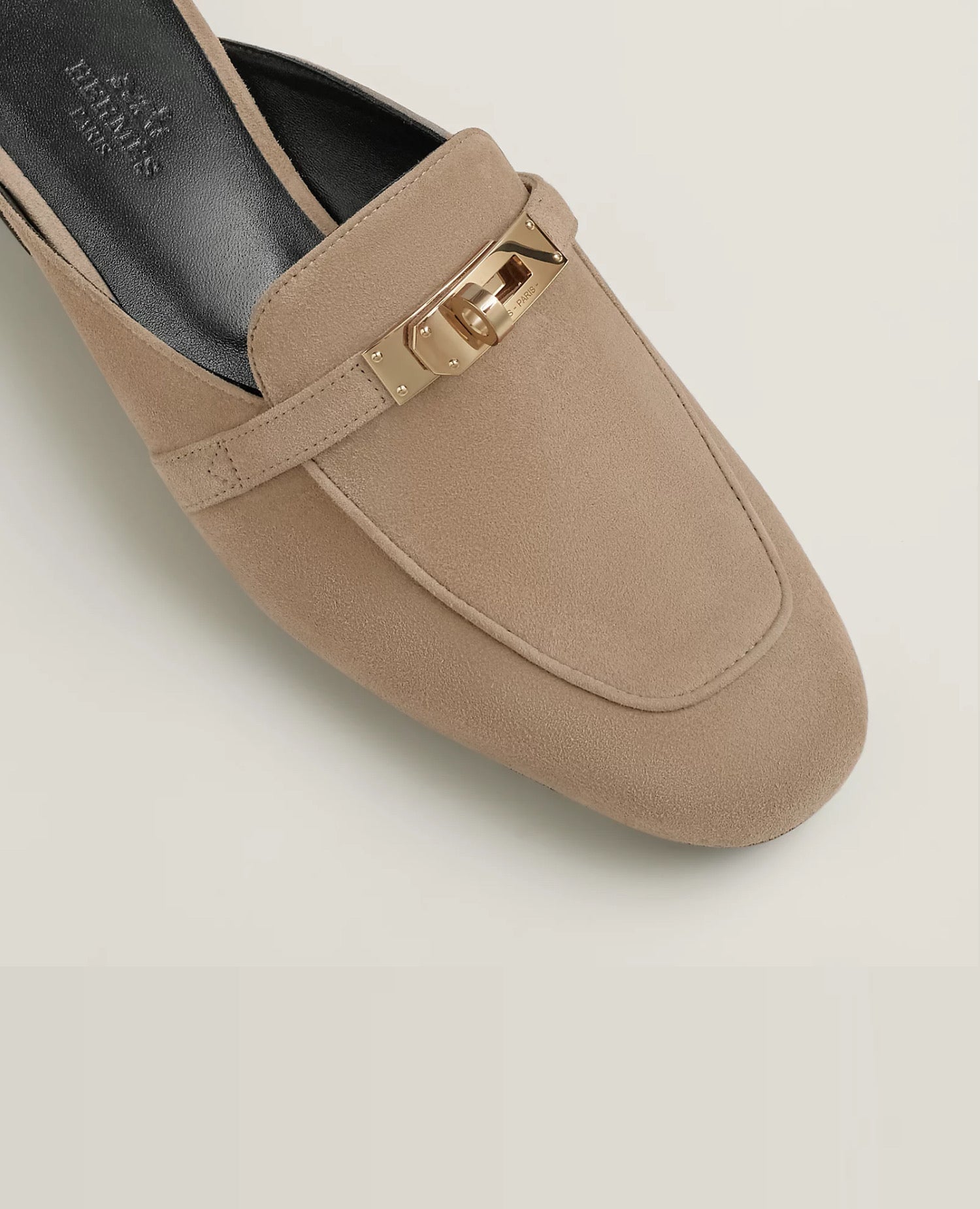 Mule in suede goatskin with iconic permabrass-plated Kelly buckle.