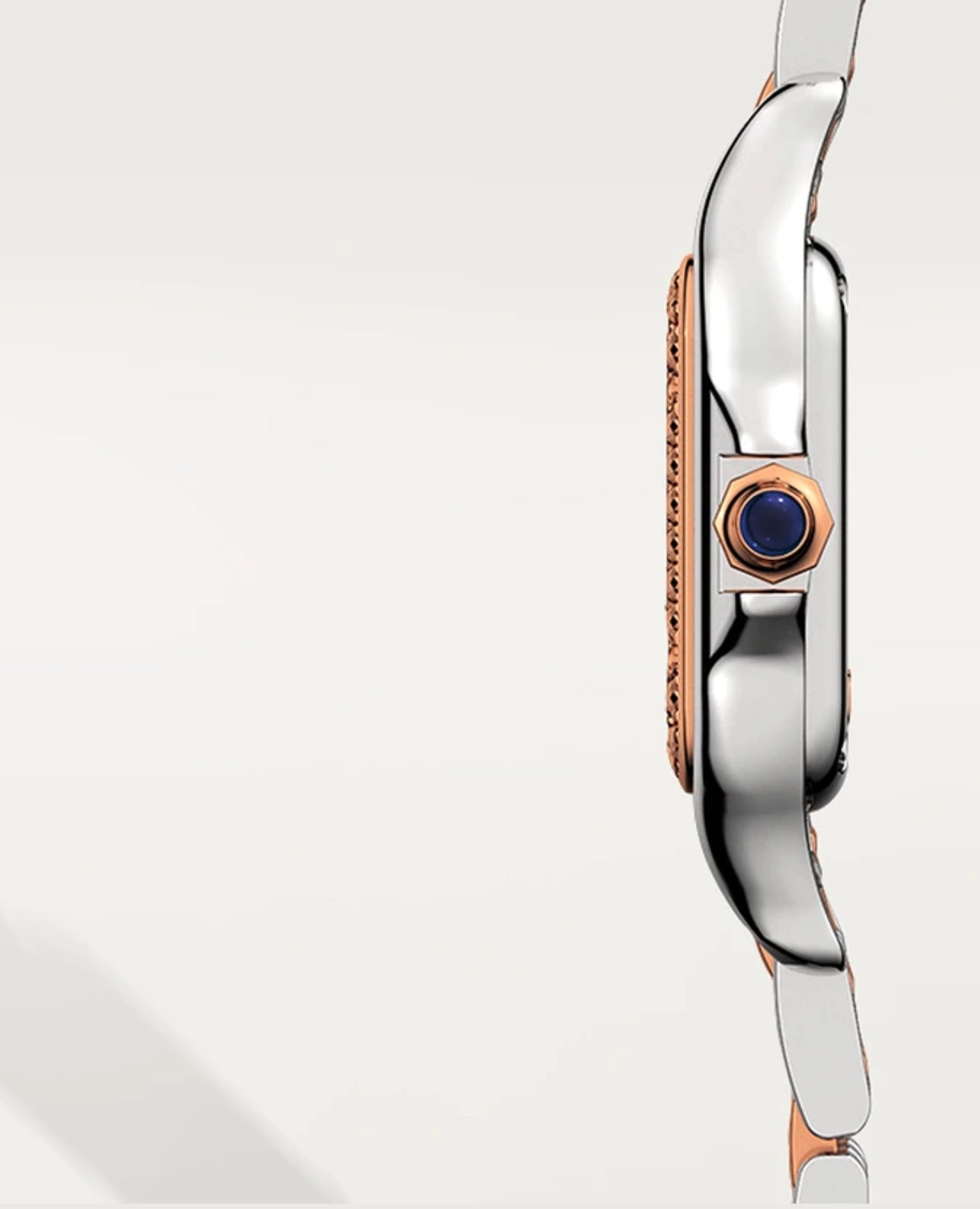 Panthère de Cartier watch, small model, quartz movement. Case in rose gold 750/1000 and steel, bezel set with brilliant-cut diamonds, dimensions: 22 mm x 30 mm, thickness: 6 mm, crown set with a synthetic blue spinel, silvered dial, blued-steel sword-shaped hands, bracelet in rose gold 750/1000 and steel, water-resistant to 3 bar (approx. 30 metres).